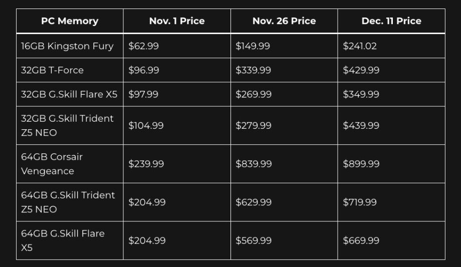 طبق گزارش Insider Gaming، قیمت رم در ماه نوامبر حدود ۲۵۰ درصد افزایش داشته و از ۲۶ نوامبر تاکنون نیز بهطور میانگین ۲۵ درصد دیگر رشد کرده است؛ بهطوریکه برخی مدلها حتی ۵۰ درصد گرانتر شدهاند. در نتیجه، حالا میتوان با هزینهای کمتر، یک کارت گرافیک جدید خرید، در حالی که برخی کیتهای رم قیمت بالاتری دارند.